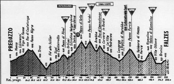 Hagamos memoria. Se trataba de la décimo octava etapa del giro. 222 kilómetros entre Predazzo y Falzes con los puertos de Costalunga, Pinei, Sella, Pordoi, Campolongo, Furcia y Riomolino (salvo Costalunga, que no puntuaba, todos eran puertos de 1ª categoría) para completar 5.500 metros de desnivel acumulado. Si la dureza de las montañas dolomíticas no era suficiente la climatología puso el resto al llover de forma ininterrumpida durante toda la etapa.