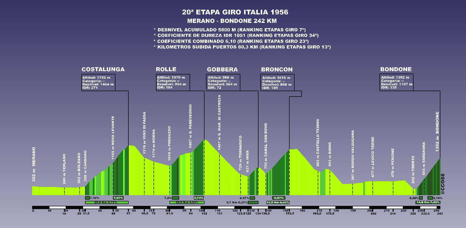 No fue una etapa cualquiera. Ha pasado a la historia como la etapa de la tempestad del Bondone pero previamente había nacido como la etapa más dura de la historia del Giro, algo que nunca antes la carrera italiana había visto. Superaba en desnivel acumulado a la mítica Cuneo-Pinerolo de 1949 y después de 68 años únicamente se ha visto superada en estas cifras por seis etapas. ¡5.800 m de desnivel acumulado! en 242 Km para llevar a los ciclistas desde Merano hasta la cota 1300, no la cima, del monte Bondone.