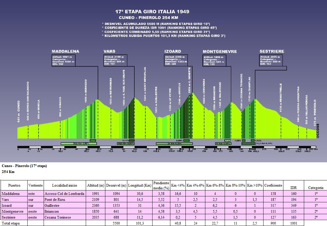 | 3 | 1949 | Cuneo – Pinerolo (17ª etapa) | 254 | 5500 | 101.3 | 22.7 | 11 | 2.5 | 1001 | 5.503 |