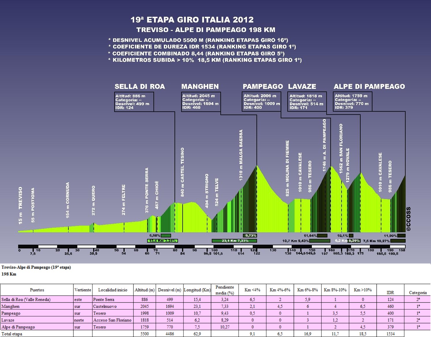 | 5 | 2012 | Treviso-Alpe di Pampeago (19ª etapa) | 198 | 5500 | 62.9 | 16.9 | 11.7 | 18.5 | 1534 | 8.437 |