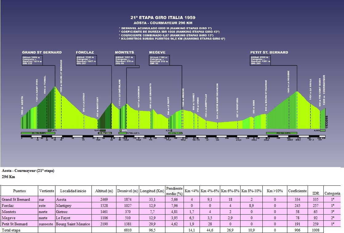 | 14 | 1959 | Aosta – Courmayeur (21ª etapa) | 296 | 6810 | 96.5 | 26.9 | 10.9 | 0 | 1008 | 6.866 |