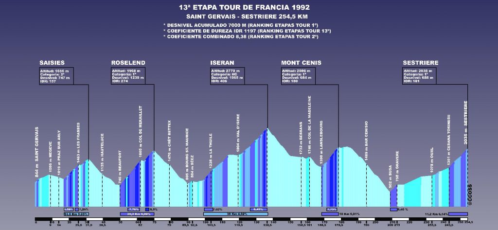 Corría el mes de julio del año 1992. Miguel Indurain venía de ganar su primer Giro de Italia por delante del italiano Claudio Chiappucci. En el Tour de Francia el navarro iba a tener como máximo rival a Gianni Bugno, ausente en aquel Giro de Italia.  Ellos dos y Chiappucci conformaban el trío de favoritos para el Tour, el mismo trío que había copado el podio del último Tour de Francia. En esta ocasión los organizadores de la carrera francesa habían diseñado una etapa alpina realmente brutal: 254,5 Km entre Saint Gervais del Mont Blanc y la localidad italiana de Sestriere.