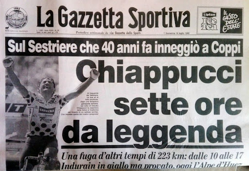 Chiappucci se llevó con todo merecimiento una etapa antológica y ante su público para mayor delirio. El italiano fue muy valiente, se la jugó, arriesgó todas sus aspiraciones en la clasificación general porque sabía que a Indurain no le podía batir en el último puerto. Su gesta no fue suficiente para ganar el Tour de Francia, pero sin embargo, convirtió en legendaria la etapa con mayor desnivel de la historia del ciclismo.