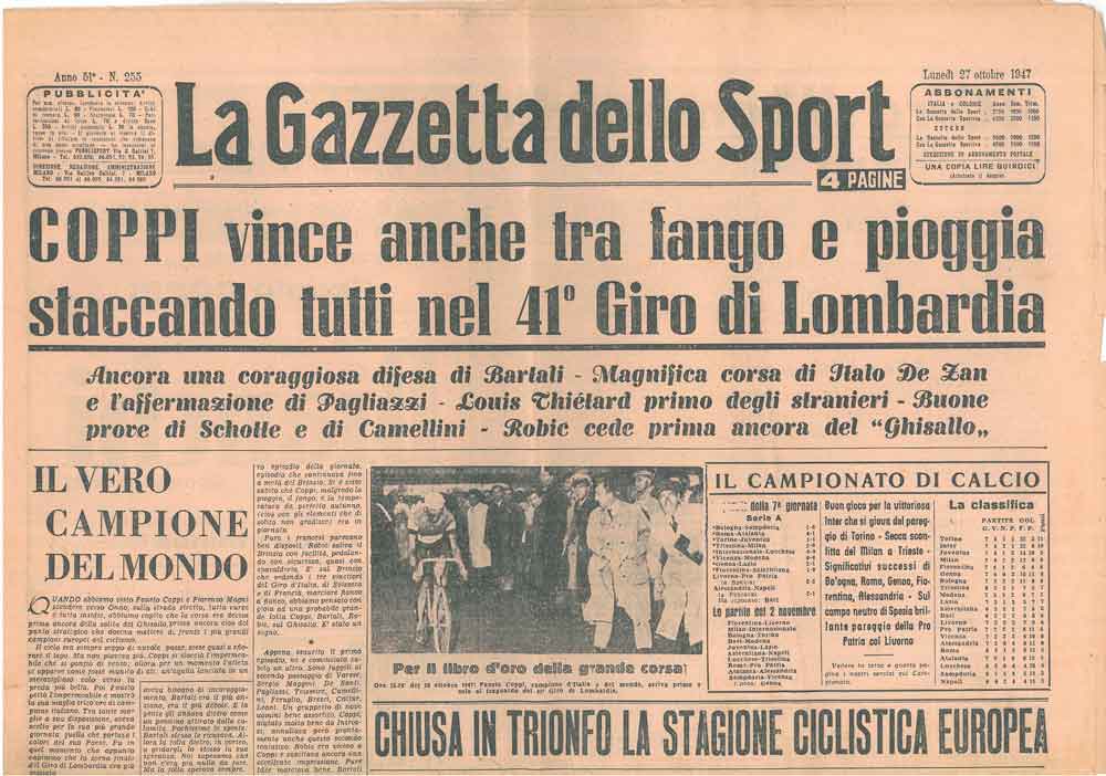 Esta es la mayor de las gestas de Coppi en sus cinco victorias en el Giro de Lombardia (Il Lombardia como se le denomina ahora). Sin embargo, días antes de aquella gesta, protagonizó otra aún más espectacular. Fue en el Giro dell’Emilia el 4 de octubre de 1947. En aquella ocasión se marchó en solitario a 170 km de meta, cruzó en cabeza los puertos del Abetone y Barigazzo para vencer en meta con una diferencia de 10:35 sobre Bartali, siempre Bartali, y 14:35 sobre Martini.